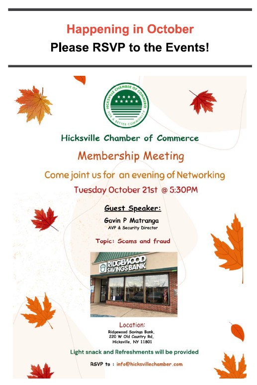 Hicksville Chamber of Commerce welcomes your business to a prime location of Long Island. Your membership in the Hicksville Chamber means you are investing in your business, your people and the overall health of the community. 300 member businesses strong, representing over 5000 employees. We encourage you to contact us to learn more about how we can help your bisiness succeed.